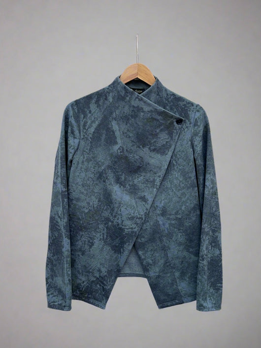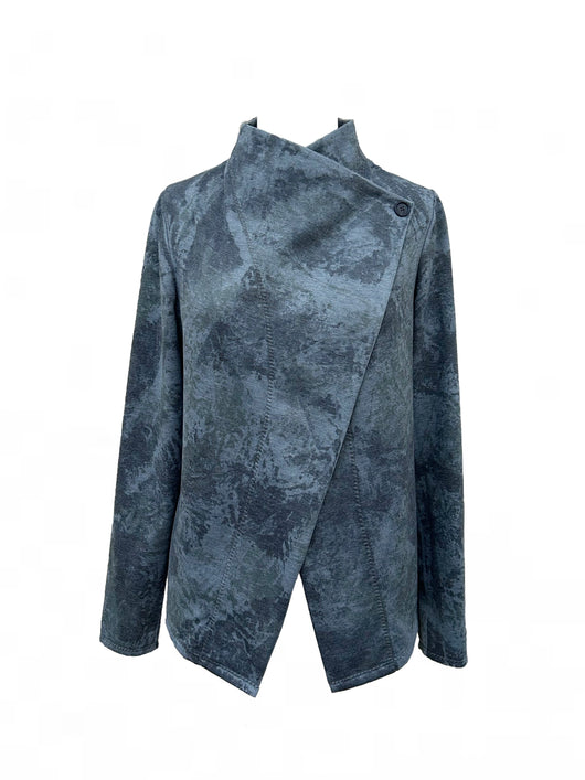 A stylish crossover sweater jacket with a button closure at the shoulder.