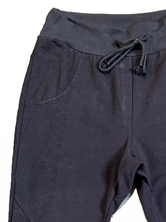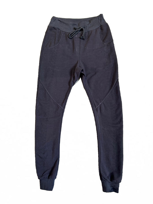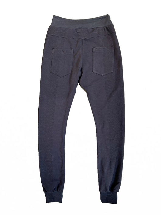 Loose fitted cozy sweat pant with elastic and drawstring at waist. Hand dyed print at sides.